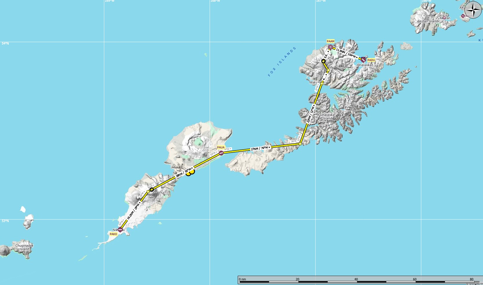 Notre 1ère visite partira de l'Umnak Island (PAKO Nikolski As Air Strip) pour arriver à l'Unalaska Island (PADU Unalaska Airport).